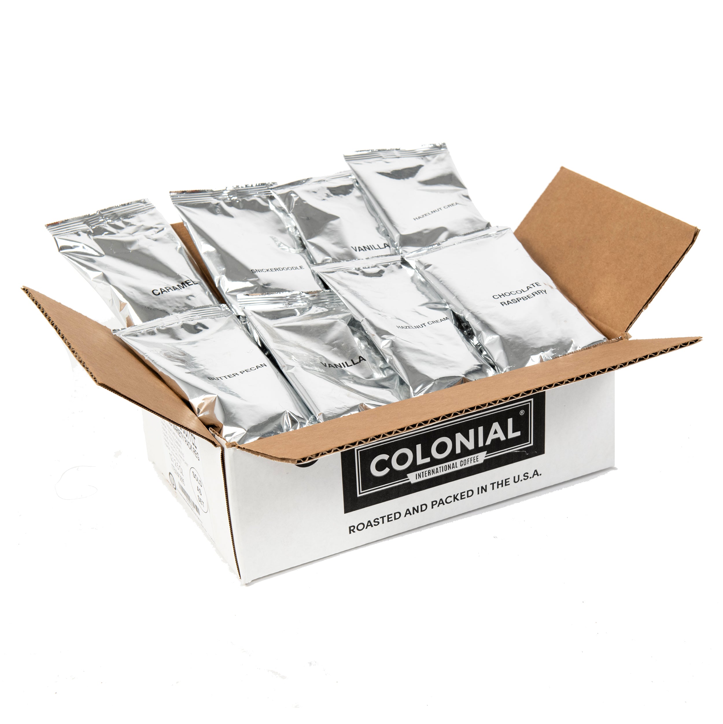 Roasted and packed in the USA by Colonial Coffee Roasters.